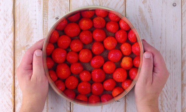 - Enlevez le pédoncule des fraises lavées et coupez-les en deux de façon à ce que vous puissiez tapisser complètement le bord du gâteau ou en faire le tour. Placez les fraises, face vers le bas, sur les miettes de cookies.