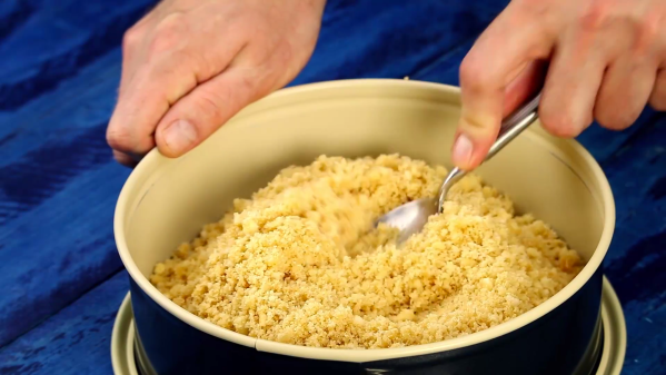 - Émiettez les boudoirs et mélangez-les au beurre fondu. Pressez ensuite le mélange dans un moule à charnière avec une cuillère à soupe.