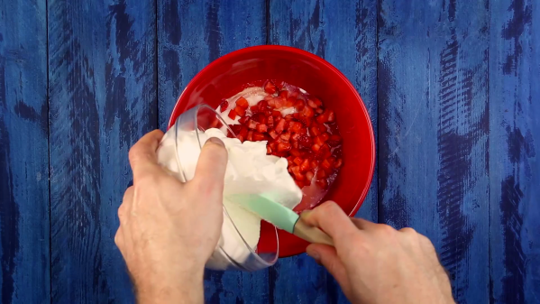 - Laissez quelques fraises de côté pour la décoration et coupez le reste en petits morceaux. Déposez ces derniers dans un saladier avec la mascarpone, l’arôme vanille et la crème fouettée. Mélangez délicatement à la spatule.