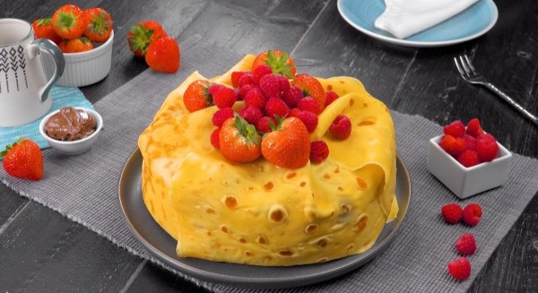 - Répétez les étapes 3 et 4, puis repliez les morceaux de crêpes qui dépassent dans le moule. Mettez le gâteau de crêpe au frais pendant au moins 1 heure. Démoulez le gâteau, ajoutez quelques fruits et admirez votre gâteau de crêpes. Doux et frais, parfait pour l'été qui approche. Bon Ap' !