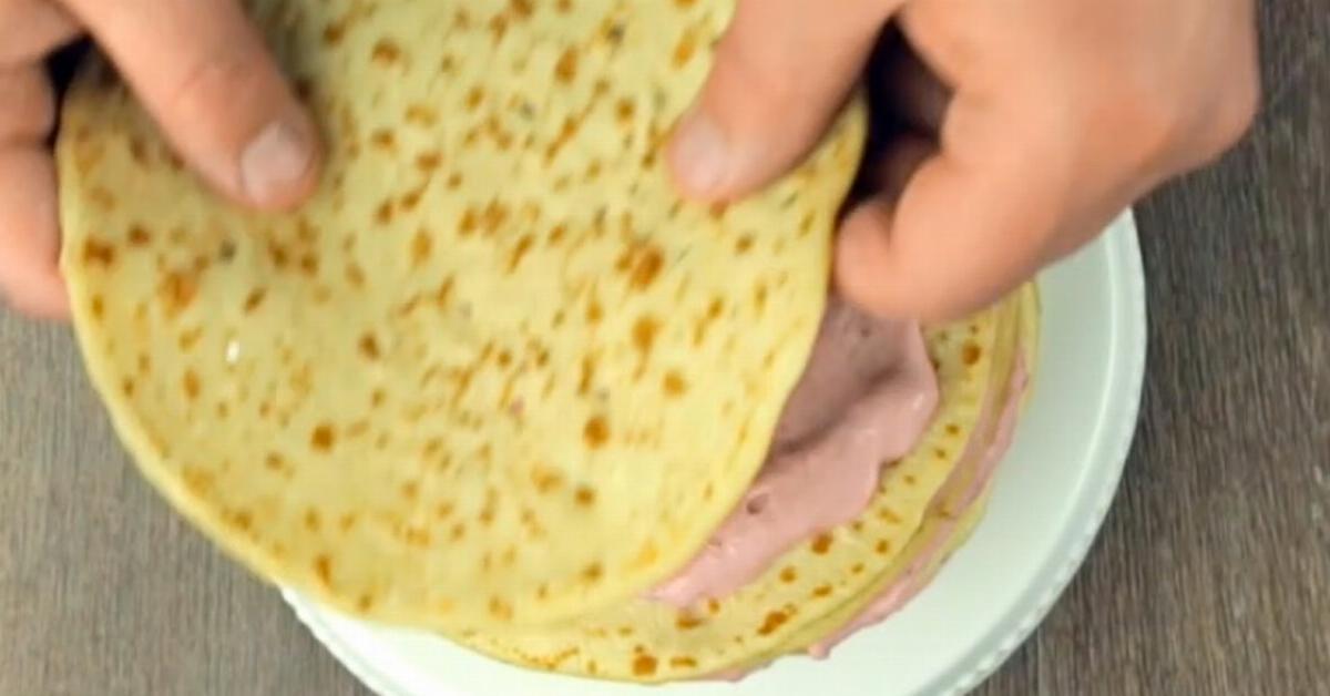 - Sur une grande assiette, déposez une première crêpe et tartinez-la d'une à deux cuillères de crème légère. Répétez cette opération jusqu'à avoir utilisé toutes les crêpes et la crème. Recouvrez le gâteau de crêpes d'un film transparent et placez-le au réfrigérateur pendant une heure.