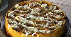 - Étalez l'huile sur la pâte vierge (au-dessus des courgettes) puis enroulez le tout en partant vers le bas (boulettes de viande) pour former une sorte de rouleau. Découpez-le ensuite en tranches de 4 cm d'épaisseur environ. Placez les tranches dans un plat, en commençant par les bords pour ensuite finir au centre.