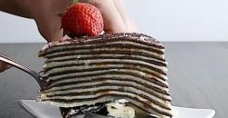 - Pour faire le gâteau, commencez la base par une crêpe nature. Ajoutez une couche de crème fouettée, puis posez au-dessus une crêpe chocolat sur laquelle vous ajoutez encore de la crème fouettée. Alternez la manoeuvre avec toutes les crêpes. Une fois qu’elles ont toutes été empilées, saupoudrez de la poudre de cacao et du sucre glace sur le dessus. Posez quelques fraises pour la décoration avant de servir en découpant les crêpes comme un gâteau.