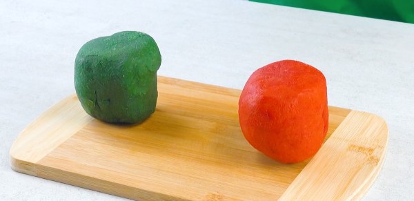 • Pétrissez rapidement tous les ingrédients avec les mains ; le sucre ne doit pas se dissoudre complètement. Coupez ensuite la pâte en deux et colorez une moitié en rouge et l'autre en vert. Formez ensuite deux boules de la taille d'une pomme avec les moitiés de pâte, enveloppez-les dans du film alimentaire et mettez-les au réfrigérateur pendant 45 minutes.