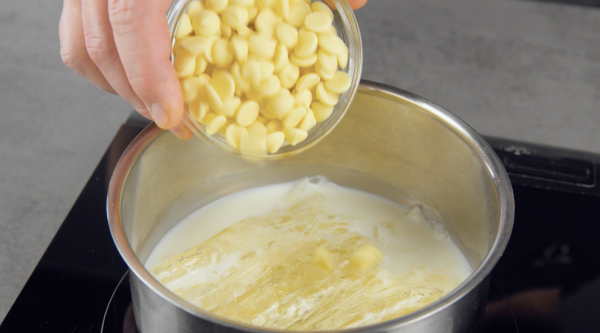 - Mélangez le fromage frais avec le yaourt, l'arôme de vanille et le sucre. Faites ramollir la gélatine et dissolvez-la dans le lait chaud. Ajoutez le chocolat blanc et remuez jusqu'à ce qu'il soit complètement dissous.