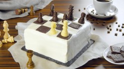 - Avant de servir, retirez le cadre de cuisson et badigeonnez entièrement l'extérieur du gâteau avec la crème au fromage frais restante, réchauffez-la légèrement pour qu'elle s'étale mieux. Pour finir, placez quelques pièces d'échecs en chocolat sur les mini plaquettes de chocolat.