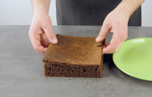 - Découpez le gâteau cuit aux dimensions de 16 x 16 cm. Coupez-le ensuite deux fois horizontalement, de manière à obtenir trois tranches d'épaisseur égale.