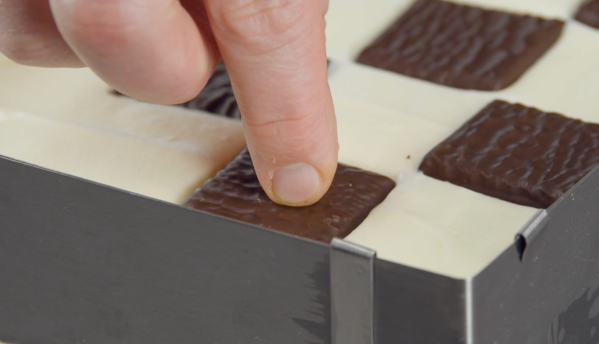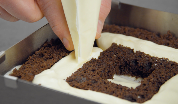 - Placez le plus grand et le troisième plus grand carré de la première garniture dans le moule à gâteau et remplissez les espaces avec la crème au fromage frais. Placez ensuite le deuxième plus grand et le plus petit carré dans le moule à gâteau et remplissez également les espaces avec la crème au fromage frais. Répétez la superposition avec la deuxième garniture de carrés, mais en inversant la disposition pour obtenir un motif d'échiquier, et également avec de la crème au fromage frais.