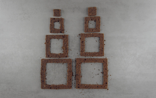 - Posez les deux autres tranches de gâteau devant vous sur le plan de travail et découpez-les chacune en quatre carrés de taille différente.