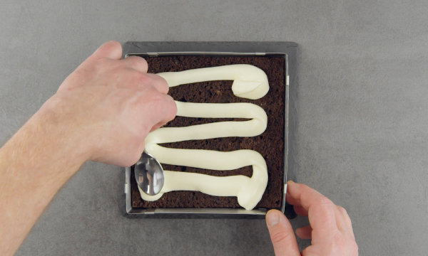 - Placez la première tranche de gâteau dans un cadre à pâtisserie carré réglable et répartissez 2 à 3 cuillères à soupe de crème au fromage frais uniformément sur le fond du gâteau.