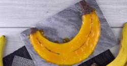 - Une fois le gâteau refroidi, démoulez le gâteau en forme de banane. Tartinez-le complètement de confiture d'abricots, sauf les extrémités que vous décorerez de chocolat noir fondu. Trempez ensuite un cure-dents dans le bol de chocolat fondu et dessinez une ligne noire sur le dessus du gâteau pour qu'il prenne la forme d'une grosse banane.