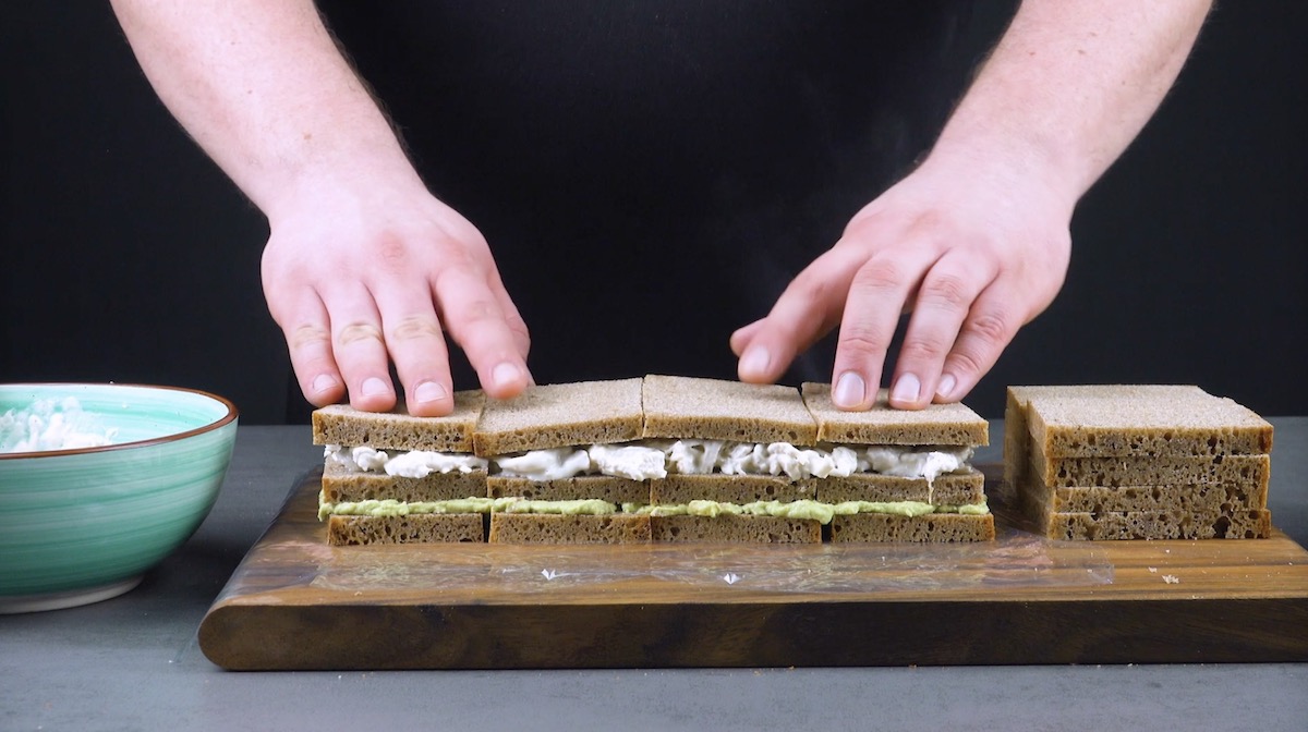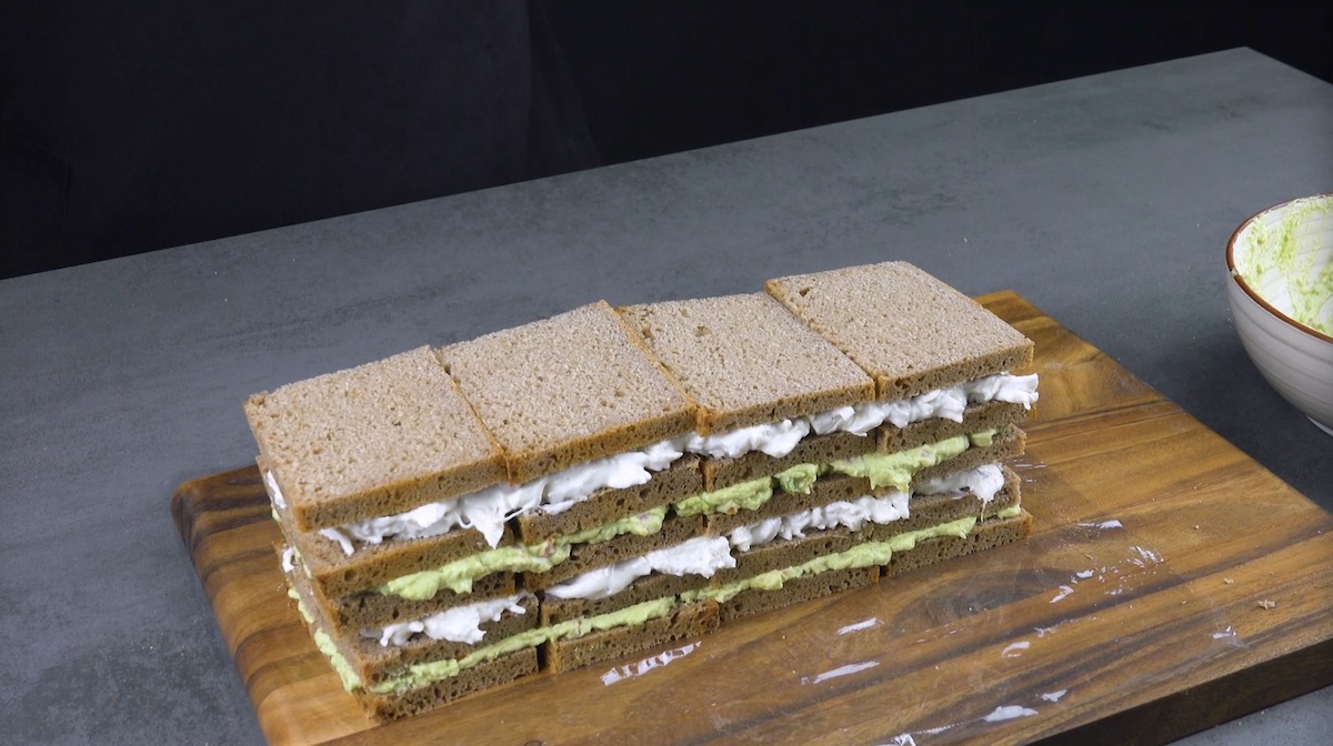 5) Répétez les étapes précédente : mettez du guacamole sur le pain, posez de nouveau des tranches de pain dessus, recouvrez-les de poulet au fromage frais et recouvrez le tout de tranches de pain.