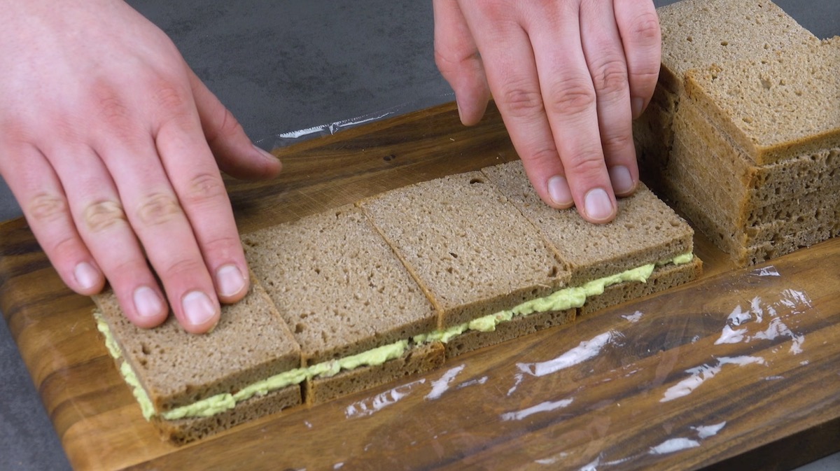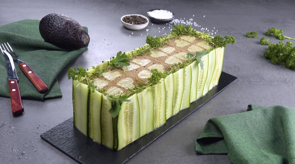6) Couvrez maintenant le gâteau avec une assiette ou une planche à découper et retournez-le délicatement pour que les motifs en forme de cœur soient sur le dessus. Enlevez ensuite lentement le film alimentaire et enduisez les côtés du rectangle de guacamole. Coupez ensuite le concombre en fines tranches allongées et appuyez-les délicatement contre le guacamole. Décorez avec des fines herbes.