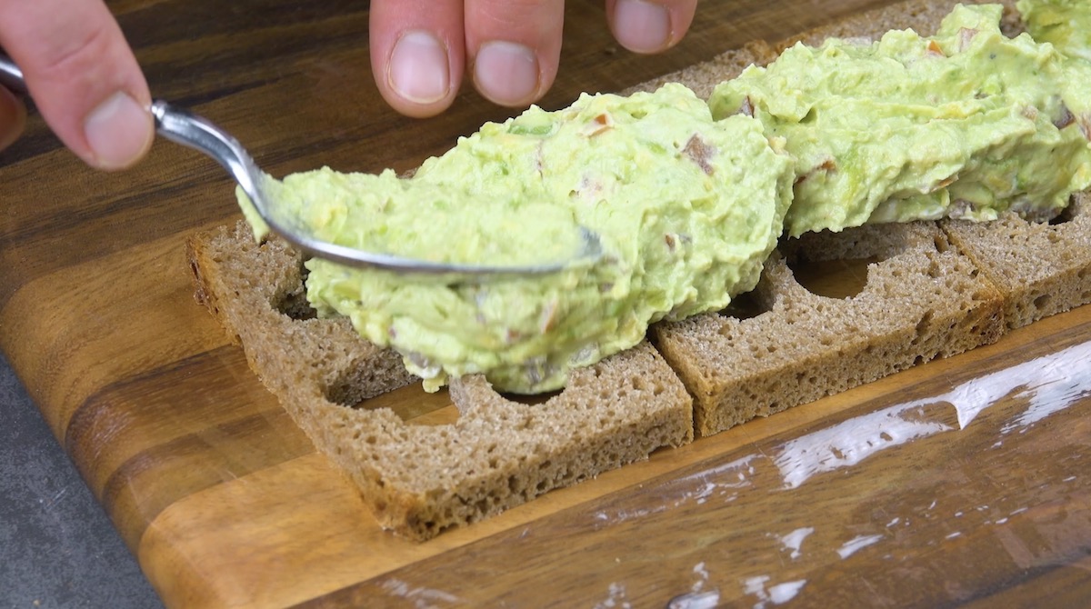 3) Placez ensuite quatre tranches de pain sur la couche de guacamole.