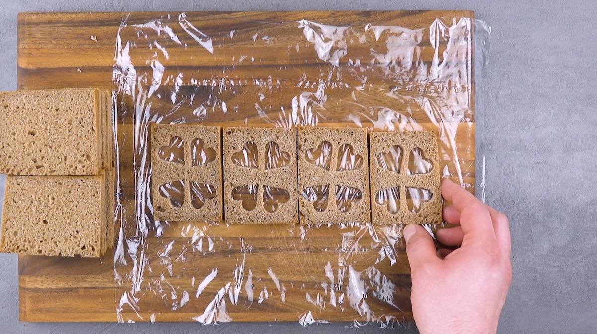 1) Coupez un ou deux pains de seigle en tranches d’environ un centimètre d’épaisseur et retirez le bord de sorte qu’à la fin vous ayez 20 carrés de pain aussi grands que possible. Faites quatre petits trous en forme de cœurs et placez-les sur un morceau de film alimentaire.