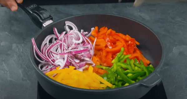 - Coupez 2 poivrons jaunes, 2 poivrons rouges, 2 poivrons verts et 2 oignons rouges en lamelles et faites-les revenir dans une poêle avec de l'huile.