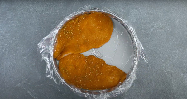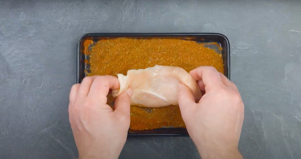 - Mettez le piment de Cayenne, le sel, le cumin, l'origan, le poivre noir et le paprika dans un saladier et mélangez le tout. À l'aide d'un couteau, coupez les blancs de poulet deux fois dans le sens de la longueur pour former des tranches fines et roulez-les dans les épices.