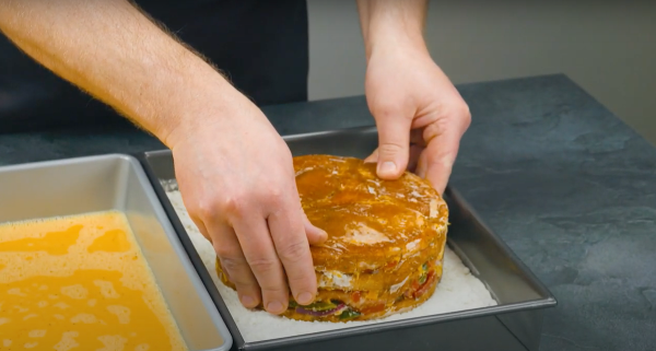 - Sortez le moule du congélateur et retirez le film alimentaire du gâteau. Assurez-vous que l'extérieur de la viande est congelé afin qu'elle soit suffisamment stable pour être panée. Préparez les œufs pour la panure en les battant et en les assaisonnant avec du sel et de poivre. Ensuite, préparez un récipient de farine et un autre de chapelure panko, et enrobez le gâteau aux fajitas de chapelure en le trempant d'abord dans la farine, puis dans l'œuf, et enfin dans la chapelure panko.