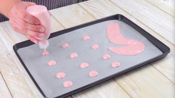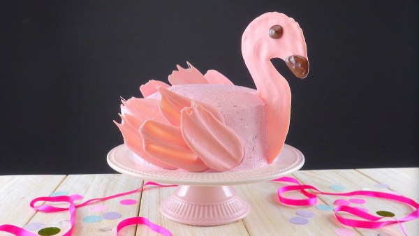 - Pour donner au gâteau au chocolat l'aspect d'un flamant rose, vous devez d'abord faire fondre le chocolat blanc et le colorer avec le colorant alimentaire. Dessinez ensuite les formes de l'oiseau sur du papier sulfurisé et attendez que la couche de chocolat refroidisse et durcisse - vous pouvez bien sûr opter pour un autre modèle.