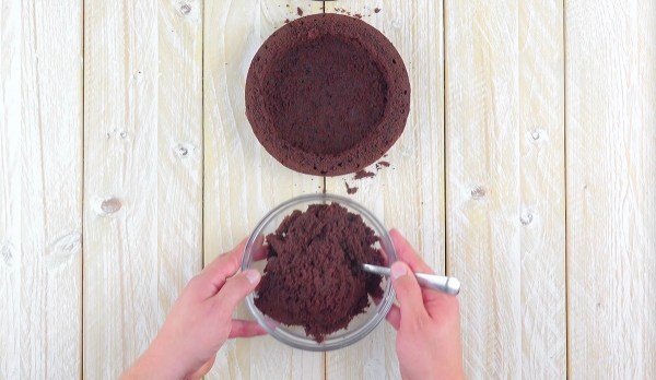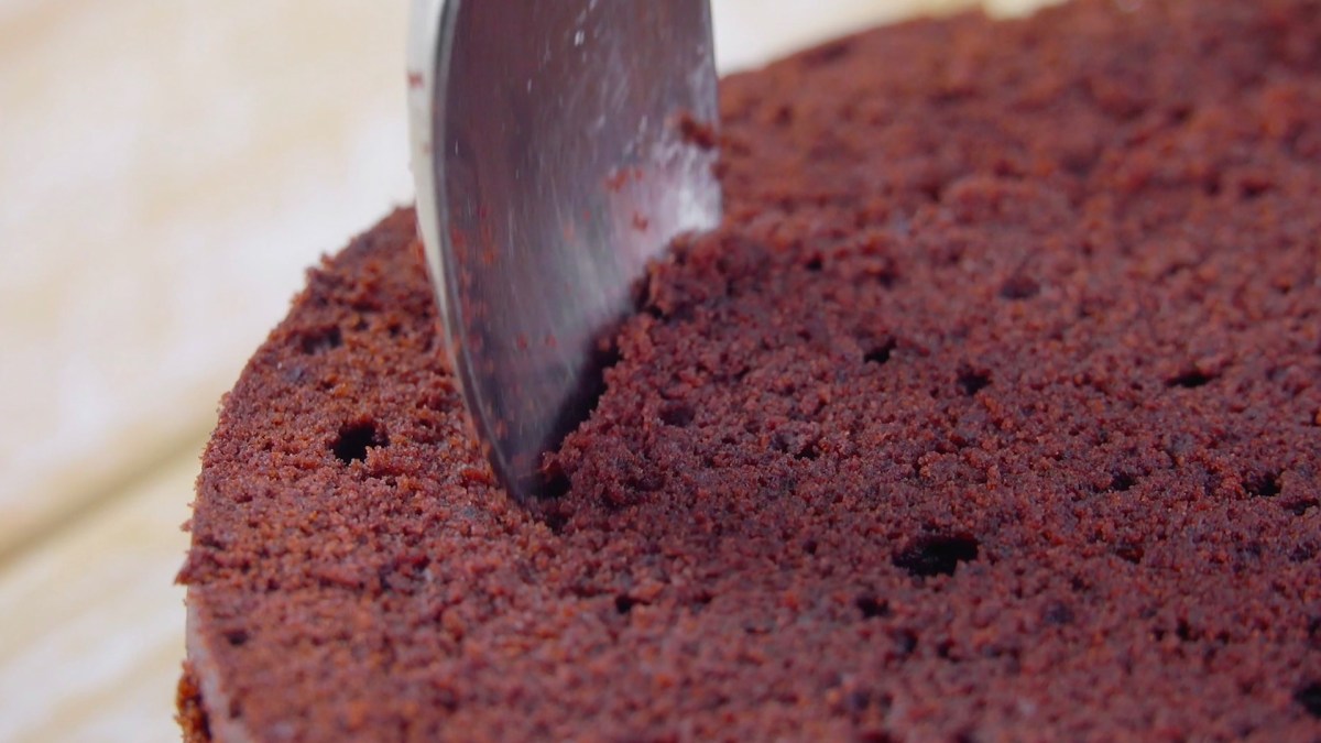 - Mettez d'abord tous les ingrédients du gâteau au chocolat dans un saladier et mélangez-les jusqu'à obtenir une pâte crémeuse. Versez ensuite le gâteau dans un moule (20 cm de diamètre) et enfournez le tout pendant 35 minutes à 160 °C en mode convection. Laissez refroidir complètement.