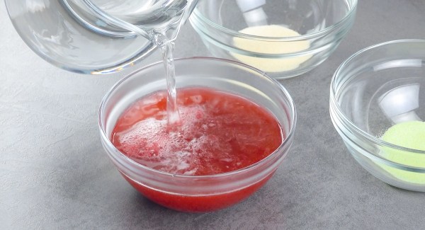 • Mettez chaque sorte de gélatine dans un bol avec du sucre et ajoutez de l'eau chaude en remuant. Conseil : si de nombreuses bulles se forment en remuant, écrasez-les à la surface.