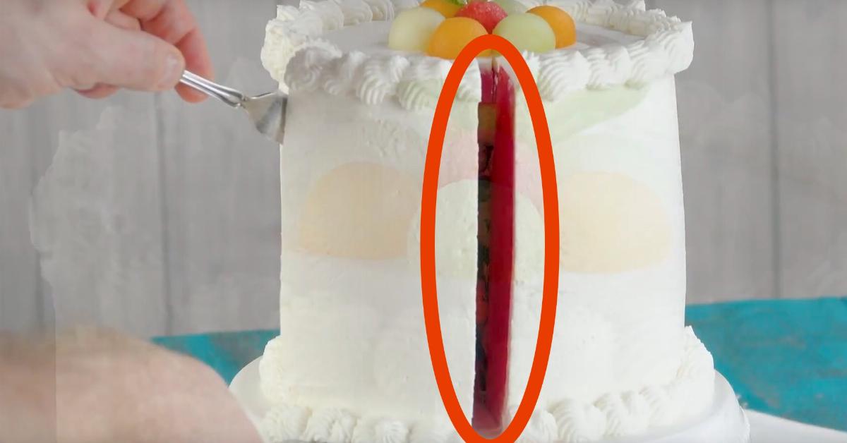 • Remplissez-la avec le mélange de boules de melon et placez la tranche de pastèque restante par-dessus pour refermer le tout. Posez maintenant l'ensemble de la construction sur une plaque à gâteau.