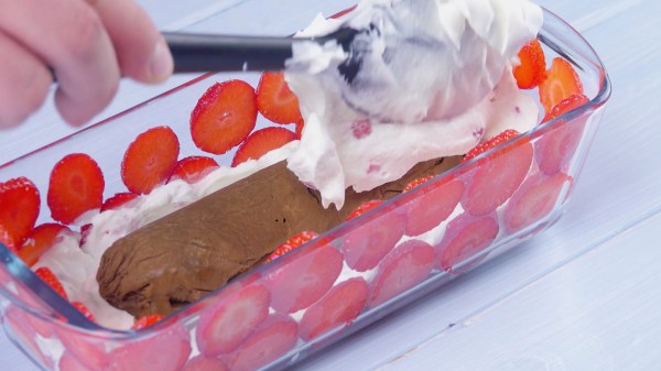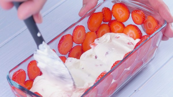 - Mélangez le mascarpone, la crème et le sucre avec un batteur électrique. Ajoutez ensuite les dés de fraises au mélange. Utilisez environ un tiers du mélange crémeux pour tapisser le fond du moule.