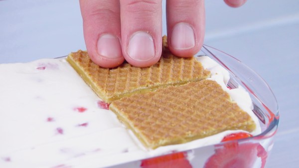 - Divisez les gaufrettes en petits carrés que vous déposez par-dessus la crème. Placez le gâteau au congélateur pendant 4 heures.