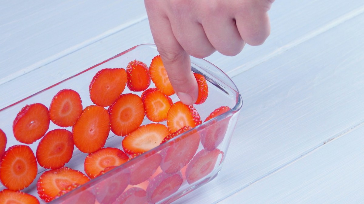 - Retirez les tiges des fraises et coupez-les en fines tranches pour recouvrir entièrement le moule.