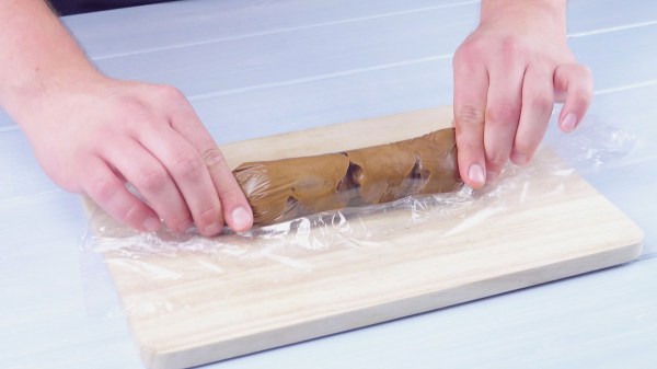 - Sur du film alimentaire, déposez 4 boules de glace au chocolat, les unes à côté des autres. Enroulez le film autour de la glace pour créer une forme de saucisse, à mettre au congélateur pendant une heure.