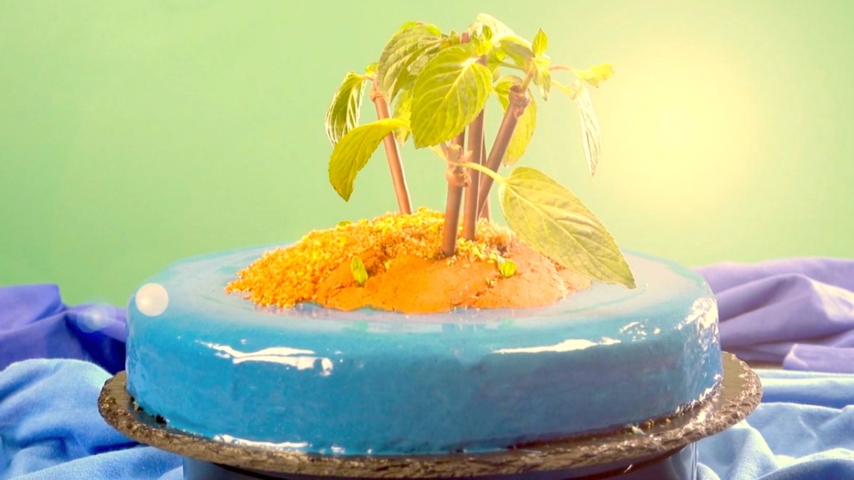 - Placez soigneusement le haut du gâteau perforé sur le glaçage et appuyez dessus lentement et régulièrement pour que le glaçage sorte des trous. À l'exception d'une petite île au milieu, toute la surface du moule à charnière devrait se remplir de glaçage bleu. Attendez que le glaçage ait durci, puis retirez soigneusement le moule. Décorez le gâteau avec des pistaches hachées, des Mikados et des feuilles de menthe pour créer votre île déserte.