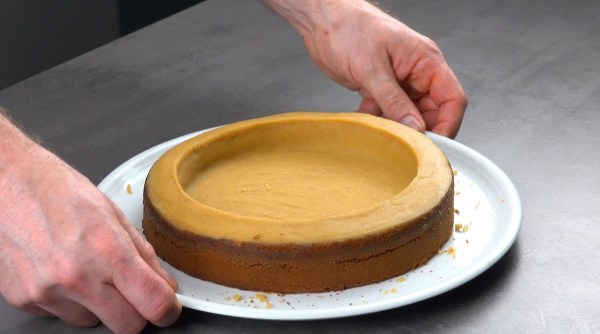 - Placez le gâteau sur une assiette creuse. Fixez le gâteau avec le bord du moule à charnière. Versez le glaçage à travers un tamis dans le gâteau. La zone évidée doit être remplie environ aux 3/4.