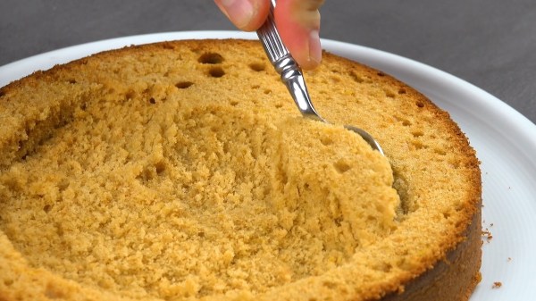 - Creusez l'intérieur du gâteau ; la zone creusée doit avoir le même diamètre que le haut du gâteau qui a été préalablement découpé ; utilisez pour cela le même bol.