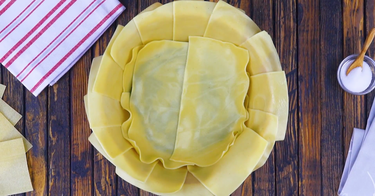 - Déposez des feuilles de lasagnes cuites tout autour d’un saladier pouvant aller au four en les intercalant. Préchauffez le four à 150°C (thermostat 5 - 300°F).