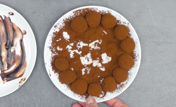 - Faites fondre le beurre dans une casserole et ajoutez le lait concentré et la poudre de cacao. Faites chauffer le tout en remuant constamment jusqu'à obtention d'une consistance crémeuse. Laissez refroidir sur une assiette et devenir ferme. Faites environ 12 boules avec la crème et recouvrez-les de cacao.