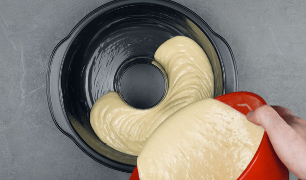 - Battez le sucre avec l'huile et les deux œufs jusqu'à ce qu'ils forment une mousse (environ 5 minutes). Ajoutez ensuite le jus de mangue, le lait, la farine, la levure chimique et une pincée de sel et mélangez le tout pour obtenir une pâte lisse. Versez la pâte dans un moule à savarin graissé.
