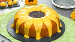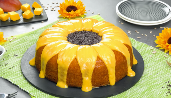 - Pelez les mangues, coupez-les en petits morceaux et mettez-les dans une casserole. Mélangez la Maïzena avec le liquide (eau ou jus) et ajoutez le tout aux mangues dans la casserole. Faites bouillir les fruits et remuez-les de temps en temps pour ne pas qu'ils brûlent. Ajoutez le lait concentré à la fin. Mixez le tout et passez la crème au tamis. Laissez refroidir complètement et versez sur le gâteau au moment de servir. Remplissez le centre de copeaux de chocolat pour que le gâteau ressemble à un tournesol.