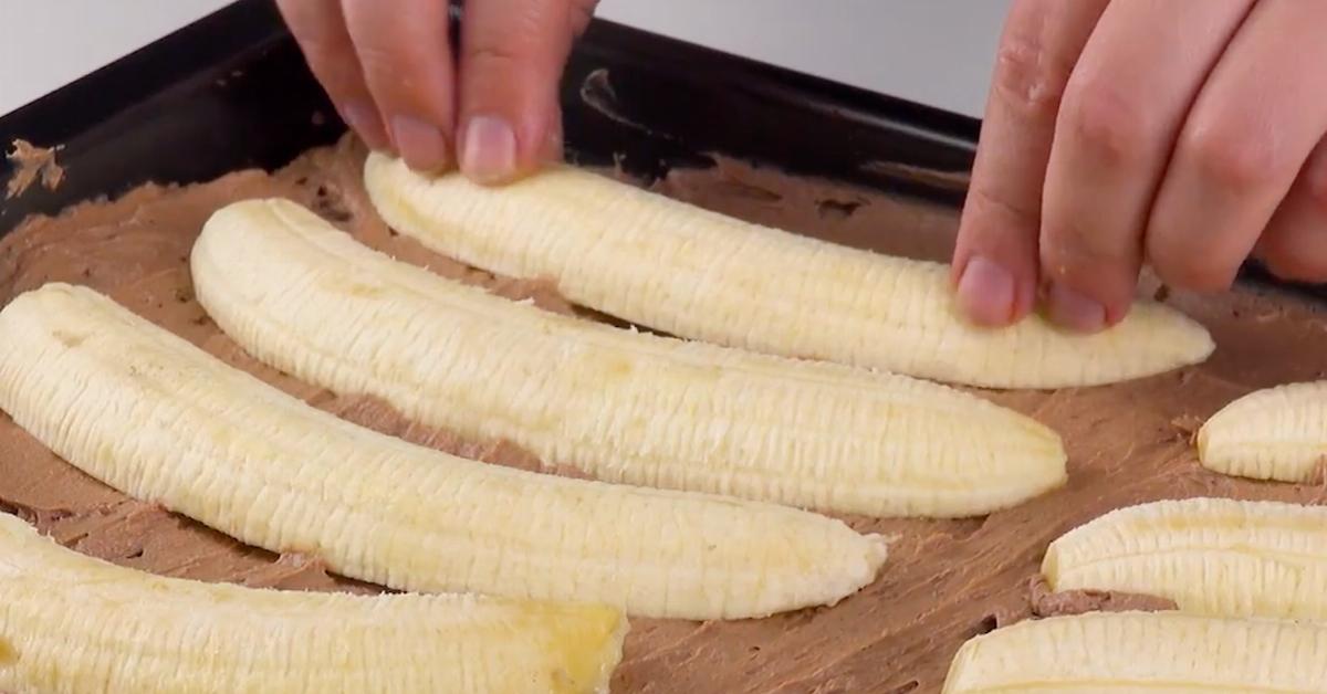 - Coupez les bananes en deux dans le sens de la longueur et déposez-les sur la crème au beurre. Étalez ensuite le reste de la crème par-dessus. Placez la pâte à motif par-dessus puis servez.