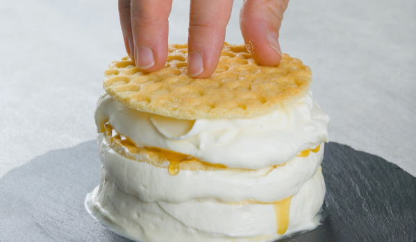 - Superposez le tout, en alternant toujours le biscuit avec le miel et la crème au mascarpone.