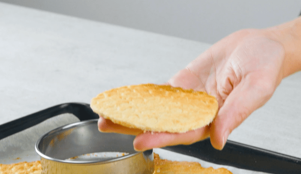 - À l'aide d'une tasse ou d'un emporte-pièce (diamètre : environ 9 cm), découpez 4 cercles dans la pâte à biscuits cuite. Il est important que la pâte soit encore chaude, sinon les biscuits se briseront lorsque vous les découperez. Émiettez le reste de la pâte et mettez les miettes de côté pour le moment.