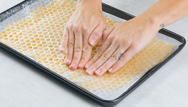 - Étalez la pâte en un rectangle et placez-la sur une plaque à pâtisserie recouverte de papier sulfurisé. Placez le papier bulle sur la pâte et appuyez doucement dessus. Ensuite, retirez à nouveau le papier bulle.