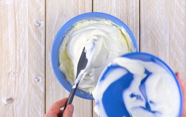 - Mélangez le fromage frais avec le sucre glace et l'arôme de vanille à l'aide d'un fouet. Incorporez ensuite la crème fouettée et mélangez jusqu'à l'obtention d'une crème lisse.