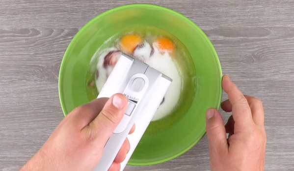 • Battez les œufs avec le sucre jusqu'à ce qu'ils soient mousseux. Mélangez ensuite la farine avec la levure chimique et incorporez-les aux œufs tout en remuant. Travaillez le beurre mou et divisez la pâte dans 2 saladiers.