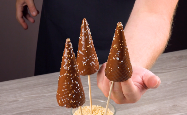 • Couronnez le gâteau avec les 3 cornets de glace au chocolat décorés.