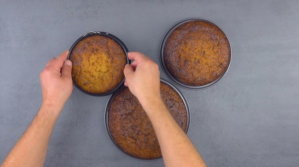 • Répartissez la pâte dans trois moules à charnière graissés de tailles différentes et enfournez les gâteaux pendant 60 minutes à 150 °C en mode convection. Laissez les gâteaux refroidir ensuite. Attention : les petits gâteaux prennent un peu moins de temps à cuire ; il est préférable de les tester périodiquement avec une baguette de bois pour voir s'ils sont cuits.