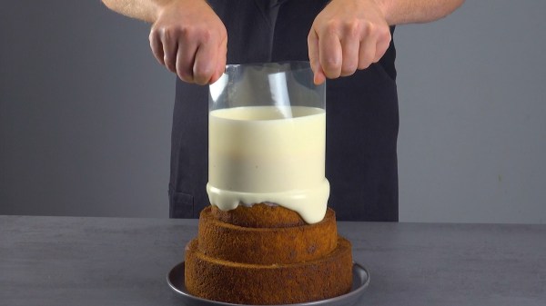 • Retirez les gâteaux des moules à charnière et empilez-les sur une plaque à pâtisserie profonde. Pour que le gâteau soit recouvert uniformément de glaçage, enveloppez le gâteau du dessus avec du ruban pâtissier, fixez-le avec du ruban adhésif et versez soigneusement le glaçage. Enlevez délicatement le ruban pâtissier pour recouvrir uniformément le gâteau de glaçage.