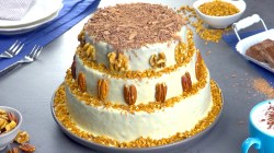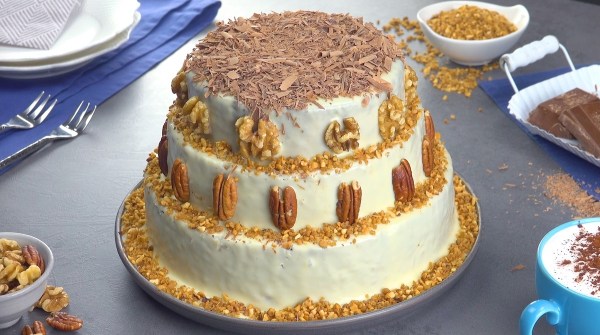 • Décorez le gâteau avec des noix, des noisettes concassées et du chocolat et laissez le glaçage sécher complètement avant de servir.