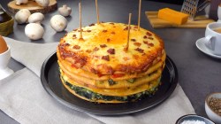 - Préparez la dernière omelette sans légumes et placez-la sur la "tour". Saupoudrez la dernière couche avec toutes sortes de fromages et avec des lardons. Enfoncez 4 pics à brochettes dans les omelettes superposées et enfournez-les à 175 °C en mode convection pendant 25 minutes.