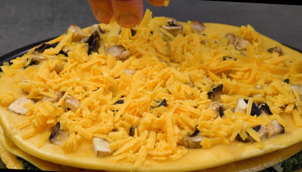 - Pour la troisième omelette, déposez les champignons finement hachés sur la pâte. Une fois cuite, placez-la sur les autres omelettes et étalez du cheddar par-dessus.