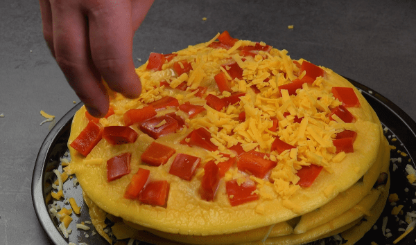 - Pour l'avant-dernière omelette, ajoutez des poivrons rouges finement hachés à la pâte, mettez-la sur les autres omelettes et saupoudrez de cheddar.